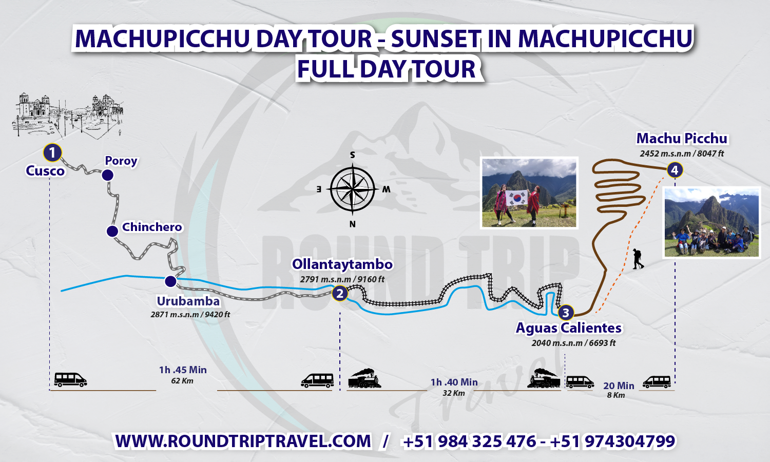 Upon arrival, a personal tour operator with a sign with your name waiting for you at the Aguas Calientes train station, like at the airport, then you coordinate the itenerary with the staff to go up at Machupicchu.